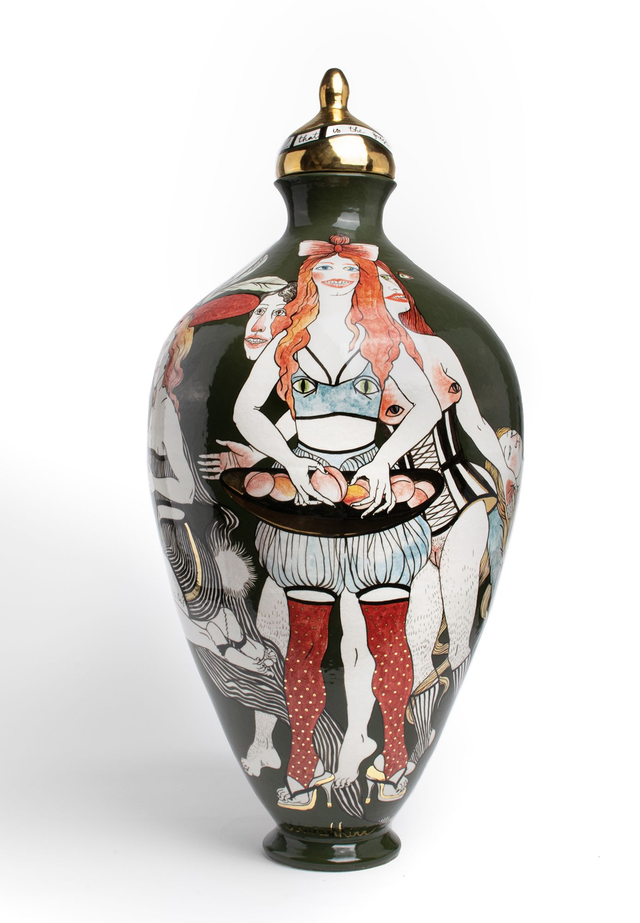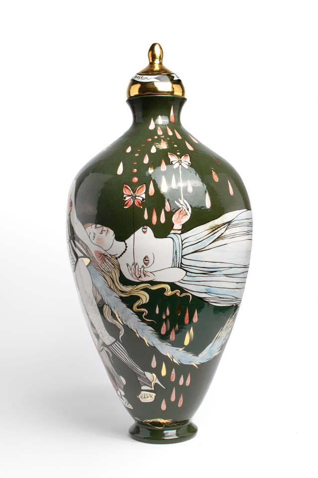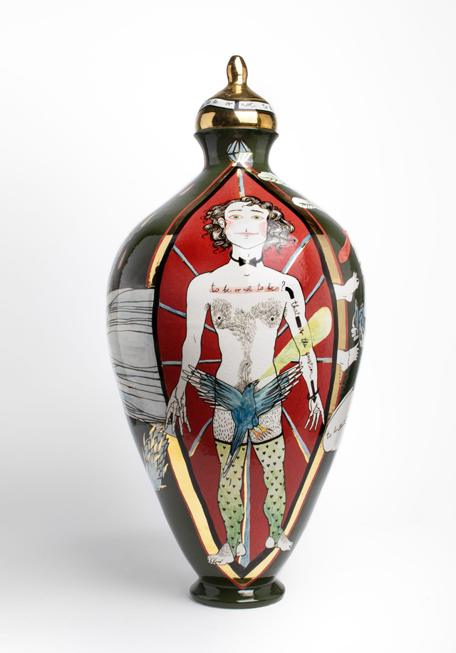 In this work I explore the eternal theme of the spiritual tossing of the character from Shakespeare's poem Hamlet. Sensual and naive at the same time, this character is surrounded by beautiful girls, including the drowned Ophelia, who offer themselves to Hamlet as the main gift in his life. But the hero is completely confused, and is unable to choose one from a large range of offers. The libido of the protagonist is depicted as a blue bird, ready to fly away at any moment. And the body of the hero is placed in the sacred symbol of the almond-shaped vagina. For me, this work combines humor and lyricism, with quotes from examples of world art.